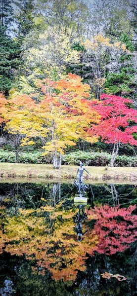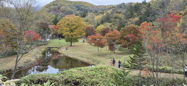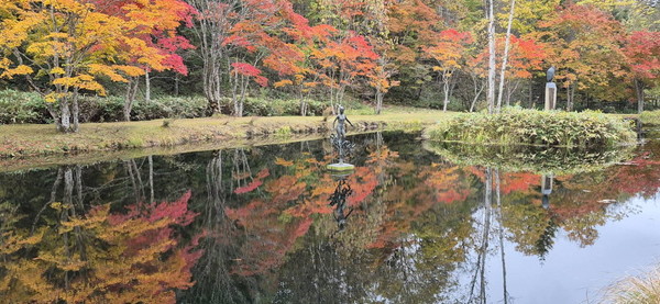 さて、芸術とともに、福原氏が大切にしたのは、自然の美である。然別湖は、パワースポットとも言われる神秘の湖の一つ。その近くに、「福原山荘」と名付けられた素敵な場所があった。九月中旬から十月中旬までの紅葉シーズン限定の無料で公開される山荘である。8,5ヘクタールの広大な敷地に、沢山の木々が植樹されていて、散策路には、小さな滝や、人工の池の庭園が整備されている。中心にある池に、計算されて植えられた紅葉の赤が映えて、絵のような美しさに見惚れた。